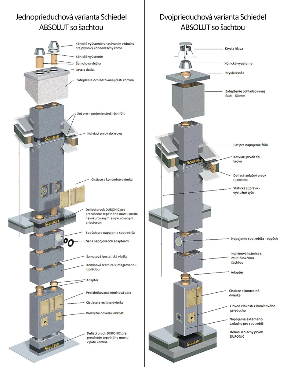 Napíšte námSchiedel ABSOLUT je jediný komínový systém navrhnutý s komponentami (prerušenie tepelných mostov, napojenie fólii, tesné dvierka, bez mriežky v päte), ideálny pre pasívne a kvalitné nízkoenergetické budovy, efektívne spolupracujúci s rekuperáciou. Tento systém s integrovanou nenasiakavou izoláciou je schopný úspešne absolvovať blower-door test na overenie tesnosti stavby a je priamo vhodný pre kondenzačné spotrebiče bez potreby dodatočného vložkovania.