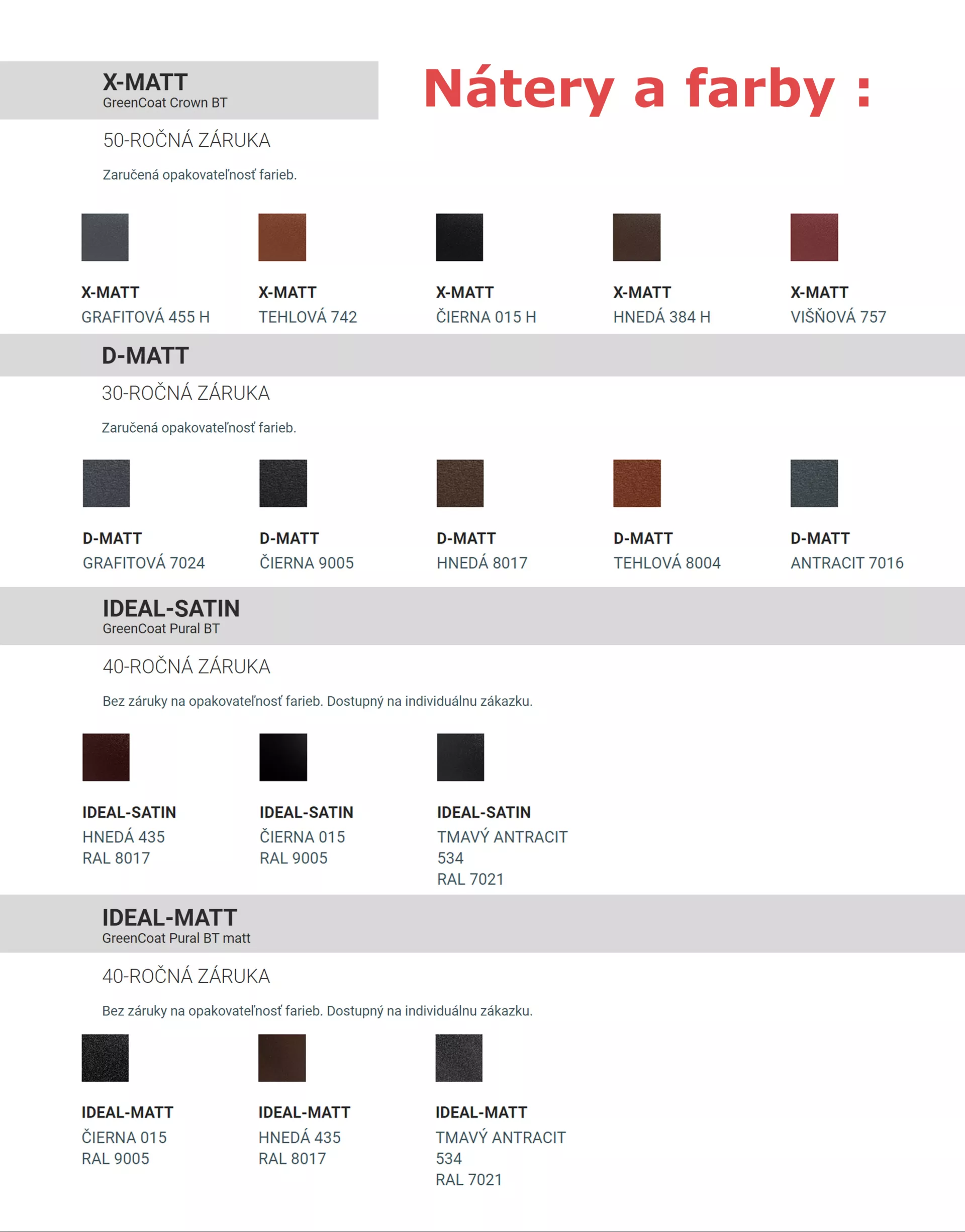 Napíšte námNáter vyrobený švédskou oceliarňou s globálnym dosahom - SSAB. Teraz ešte ekologickejší. Vďaka unikátnemu svetovému patentu, bola veľká časť tradičných zložiek z ropy nahradená švédskym repkovým olejom. Zvýšená produkcia povrchovo upravených materiálov dokazuje, že sortiment výrobkov najvyššej kvality, z ocele s povrchovou úpravou GreenCoat®, je najviac ekologickú ponukou ocele s organickým povrchom, ktorá je určená pre stavebníctvo. Ako jediní v Európe máme písomnú záruku opakovateľnosti farieb od SSAB. Náter patrí do kategórie antikoróznych náterov v súlade s normou EN 10169. Zaručuje veľmi dlhú životnosť produktu, posilňuje odolnosť proti mechanickým poškriabaním a UV žiareniu. Vysoká odolnosť náteru proti korózii X-Matt bola testovaná vystavením v agresívnom morskom a priemyselnom prostredí. Zinkový náter má min. 275 g/m². Trvanlivosť a krása je X-MATT.
